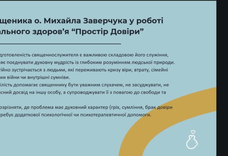Про діяльність хабу ментального здоров’я «Простір Довіри» у Запоріжжі, шлях розвитку та його внесок у підтримку громади розповіли його фахівці. Психологиня Лариса Бондаренко та священник о. Михайло Заверчук поділилися практичним досвідом поєднання психологічного супроводу й духовної опіки в умовах сьогодення, підкресливши важливість комплексного бачення людини з урахуванням як психологічної, так і духовної складової.